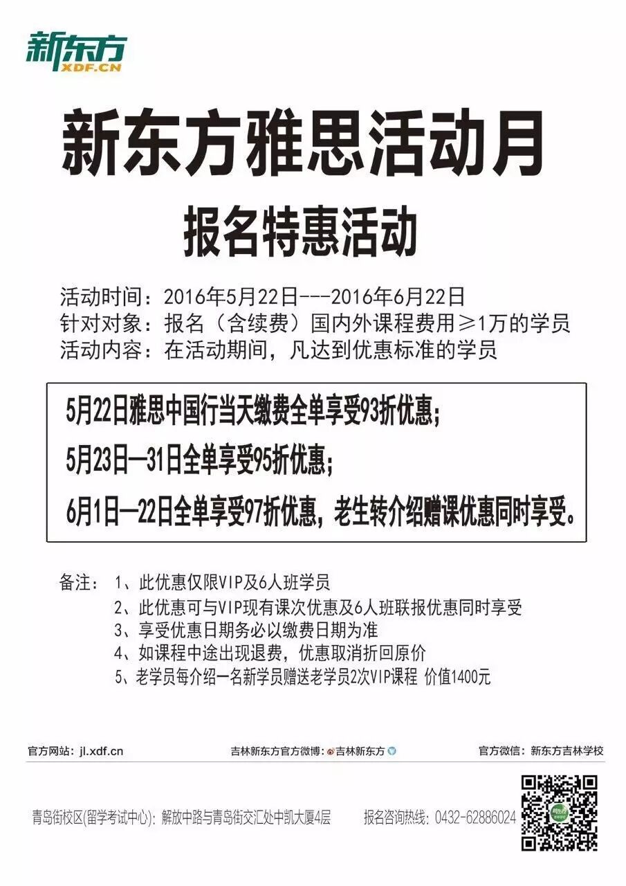 在5月22日至6月22日期间,凡报名吉林新东方国外考试部一对一及一对六课程的学员,均可享受巨幅优惠,详情,请拨打0432-62886024进行报名咨询!